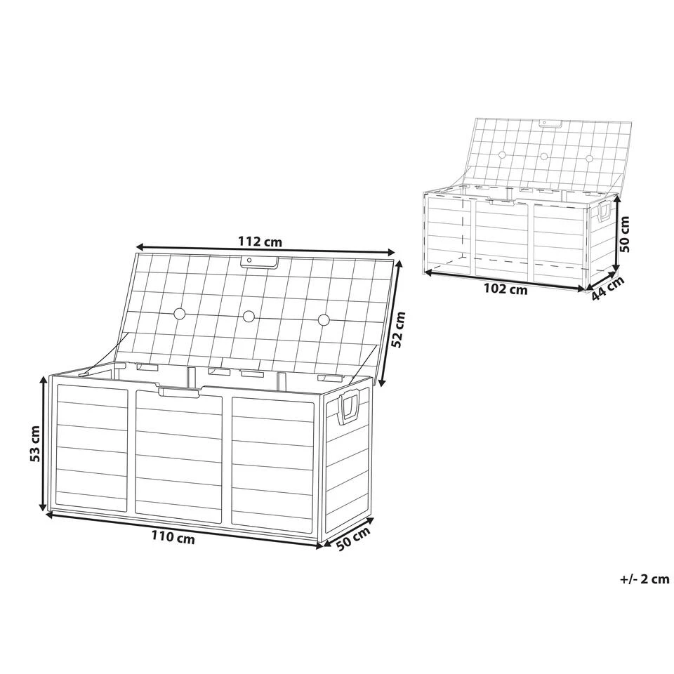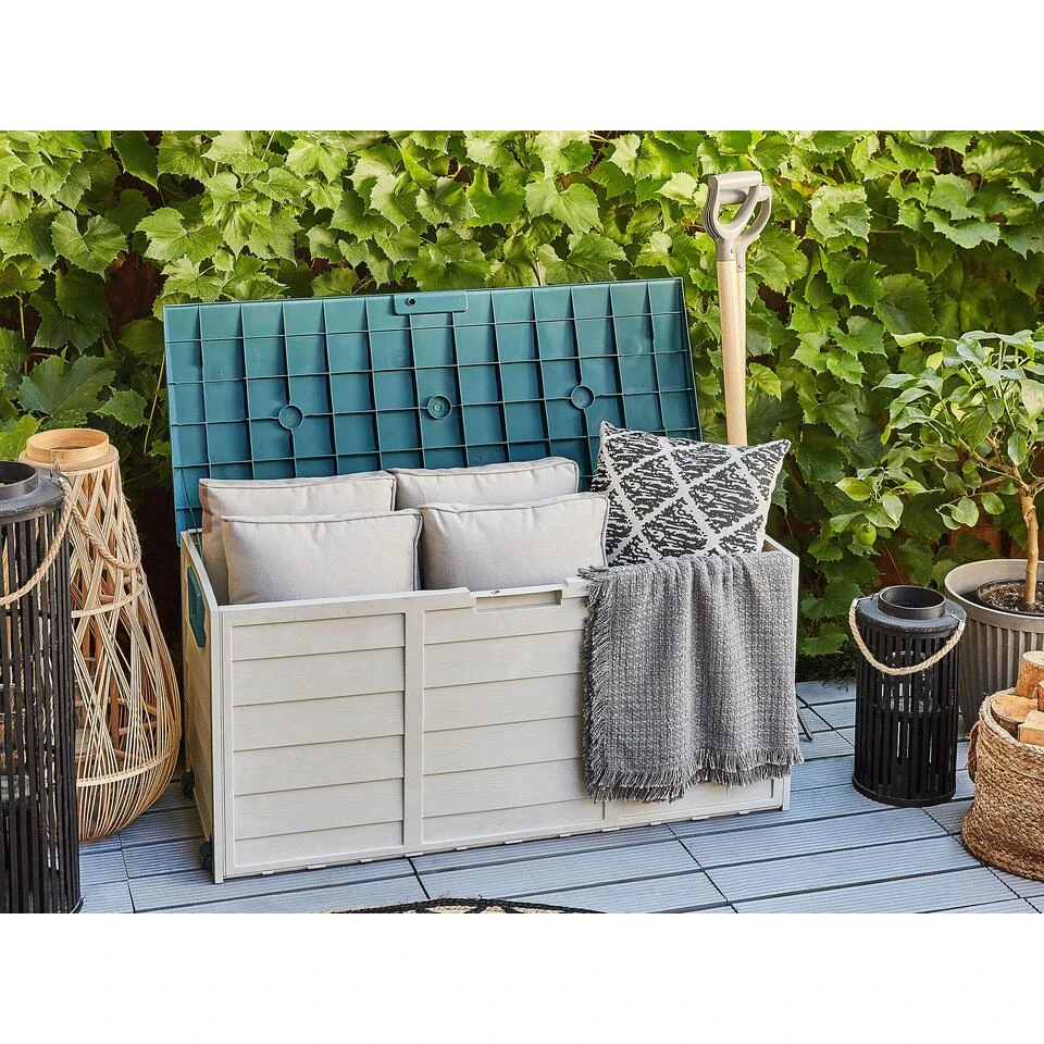 Kunststof opbergbox met wielen. Met deze ruime opbergbox berg je gemakkelijk je tuingereedschap, buitenkussens of regenhoezen op als je ze even niet nodig hebt. De box is gemaakt van duurzaam synthetisch materiaal en heeft geen dagelijks onderhoud nodig om jarenlang mee te gaan. Dankzij het deksel dat het bovenste deel van de container afdekt, worden de items die erin worden bewaard niet vuil. De opbergbox is voorzien van handgrepen en zwenkwielen zodat je hem gemakkelijk en wanneer je maar wilt kunt verplaatsen.