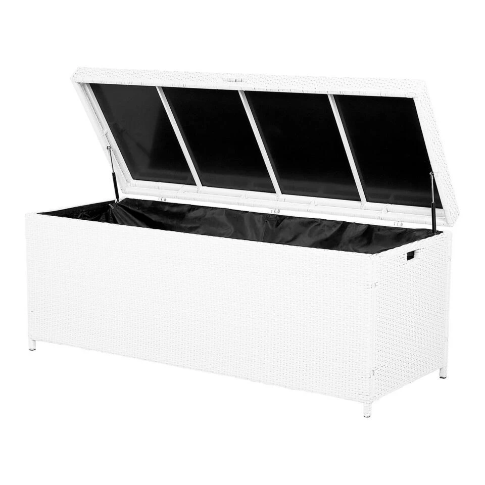Praktische, brede opbergbox in wit met veel opbergruimte. Deze kussenbox biedt veel opbergruimte en beschermt jouw kussens en dekens tegen water en zon. Dankzij de twee praktische handgrepen aan de zijkanten is de tuinkist gemakkelijk te vervoeren. Het rotandeksel kan gemakkelijk worden geopend en gesloten met twee gasveren. Een zwarte binnenschaal voorkomt het binnendringen van vuil en insecten. Het binnenste omhulsel uit ÊÊn stuk is bevestigd met een sterke klittenbandsluiting en heeft dus optimale grip en kan indien nodig worden vervangen of gewassen. Houd er rekening mee dat bij zware en langdurige regenval de doos moet worden afgedekt.