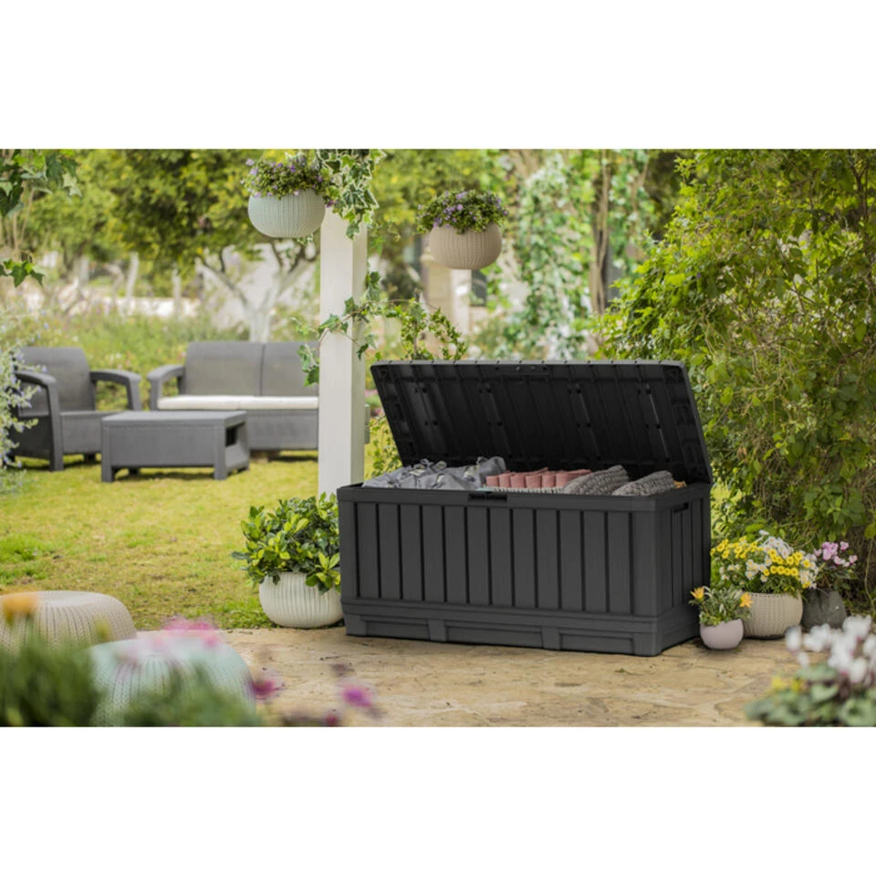 Berg je tuinspullen gemakkelijk en droog op in de ruime Keter Kentwood Opbergbox (350 liter). Met de stijlvolle houtlook is deze handige opbergbox een blikvanger in iedere tuin. De box is gemaakt van weerbestendig en duurzaam kunststof. Deze grote opbergbox houdt al je tuinspullen droog. Hij is stevig en biedt op het deksel een zitplaats voor twee volwassenen. Handig, zo bespaar je tenslotte ruimte in de tuin. De opbergbox is afsluitbaar met een hangslot (niet meegeleverd) en is grafiet van kleur.