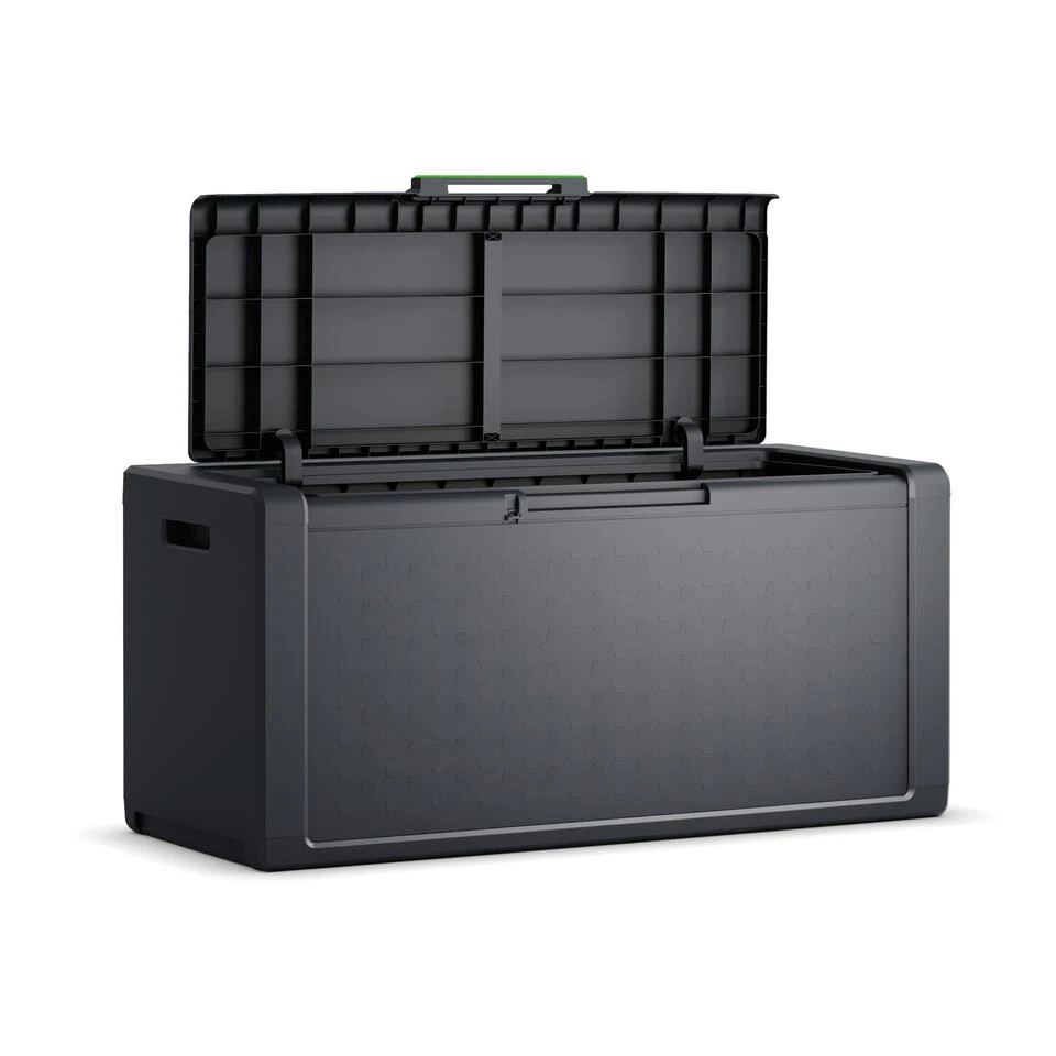Deze multifunctionele opbergkist is uitstekend geschikt voor bijvoorbeeld het opbergen van tuinkussens. De tuinkussenbox heeft een inhoud van maar liefst 300 liter. De box is af te sluiten met een hangslot. Wij adviseren om de box nooit in de open lucht te zetten, aangezien er water in de box kan lopen bij het openen als deze nat is.
