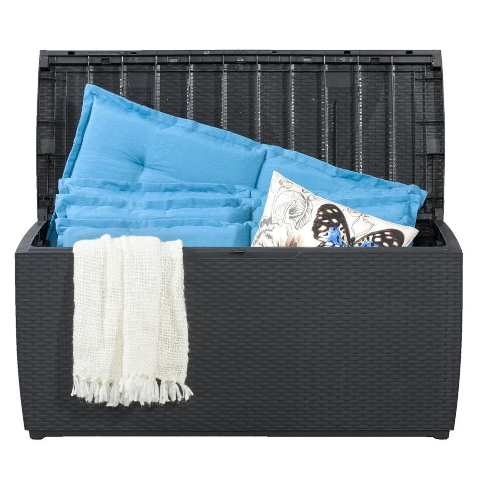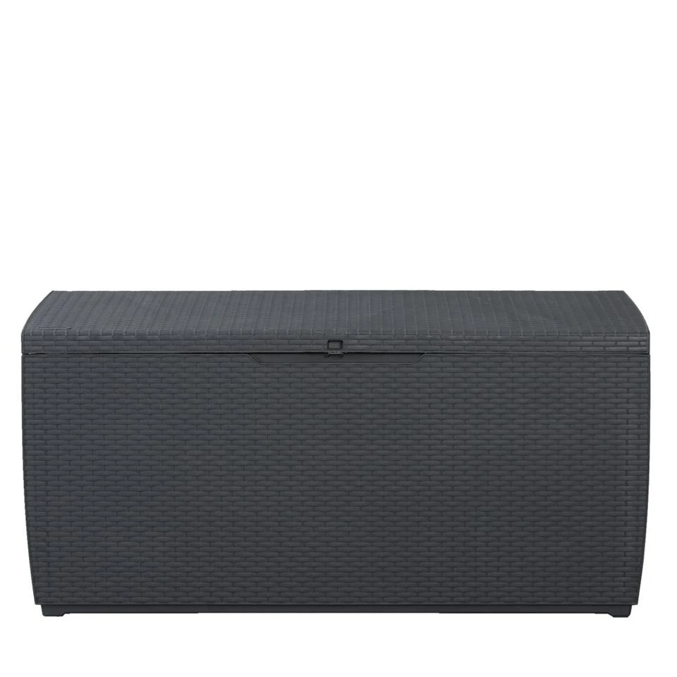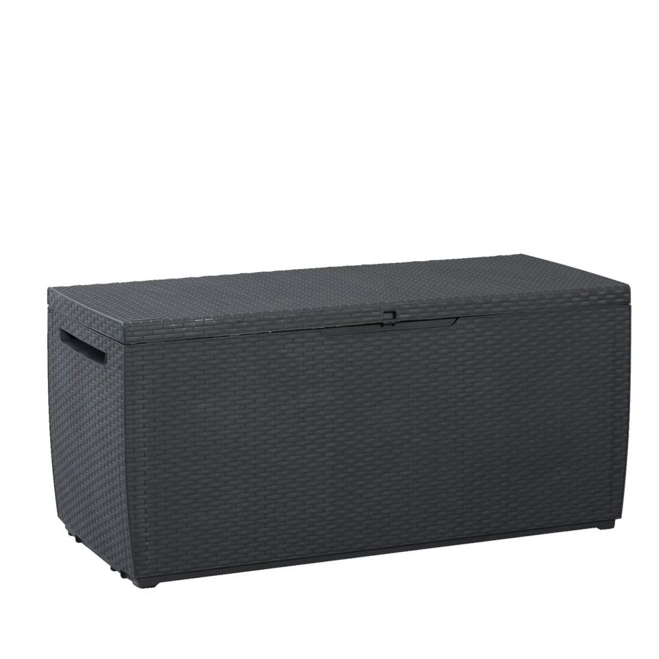 Deze kussenbox is antracietgrijs van kleur en heeft een inhoud van 302 liter. Hij heeft dus genoeg ruimte voor je tuinkussens en tuinaccessoires, die je liever niet laat natregenen. Met deze tuinopberger blijft jouw tuin netjes! Deze opbergbox is gemaakt van hoogwaardig kunststof wicker, hij heeft dus een trendy look en je kan hem het hele jaar buiten laten staan. Opbergbox Capri is weersbestendig en onderhoudsvrij.