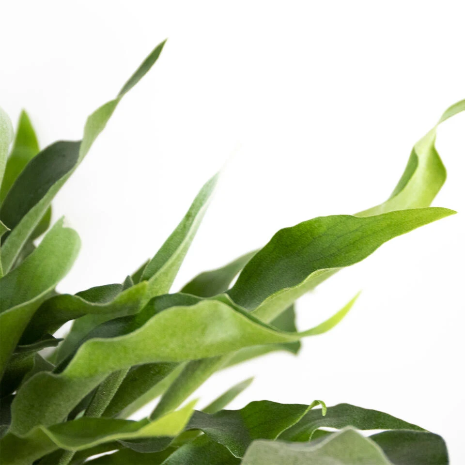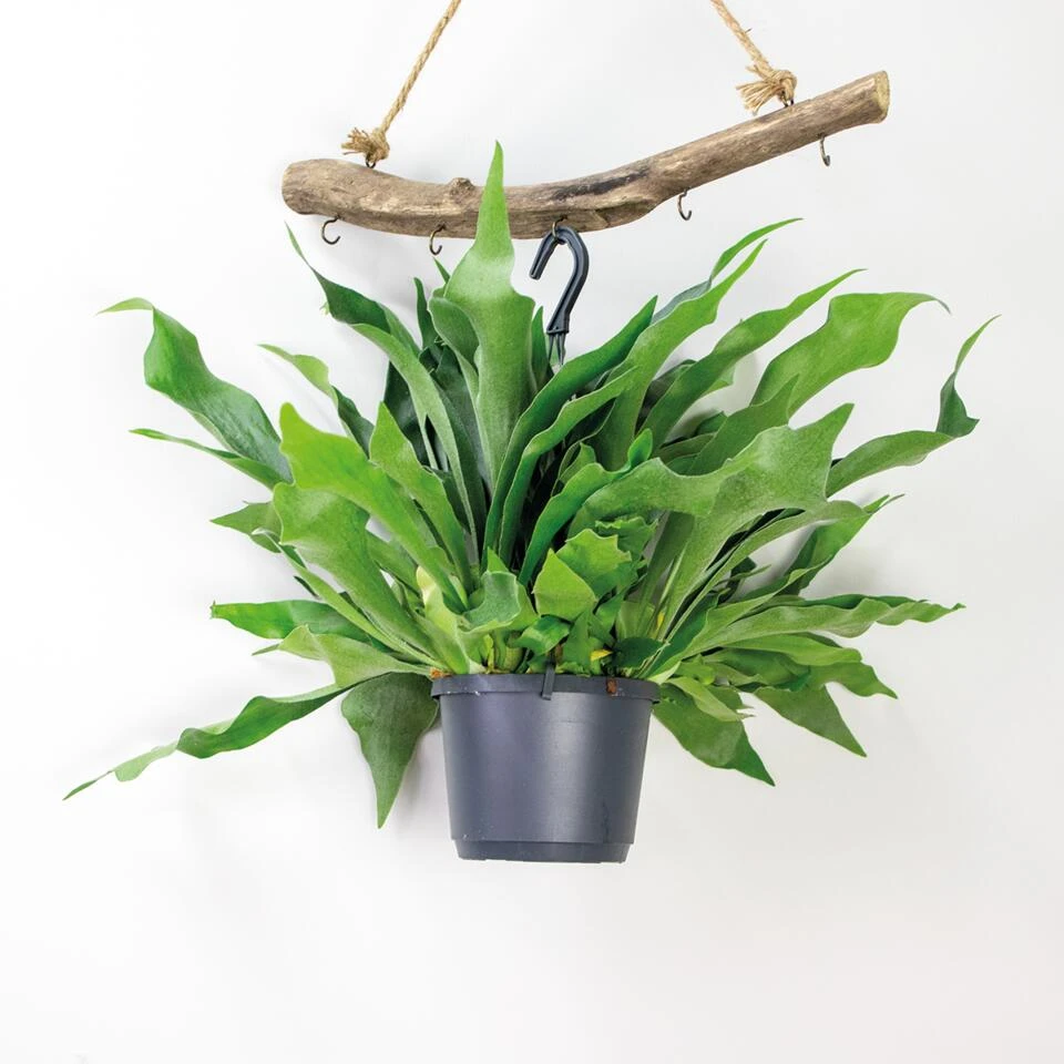 Don’t leave me hanging, want deze unieke Platycerium Bifurcatum kan je ook fantastisch stijlen in een pot. Deze Herftshoornvaren heeft zijn naam te danken aan zijn zilvergroene geweivormige bladeren. Niet alleen hebben de bladeren aan deze varen een unieke look en feel, ook hebben deze een voedingsfunctie. Zo kleuren de middelste bladeren van de varen bruin – verwijder dit blad niet. Deze zorgen namelijk voor extra steun en wanneer zij eraf vallen geven zij weer extra voeding aan de plant. Dit maakt de plant niet alleen uniek om naar te kijken, maar ook nog eens bijzonder efficiënt.