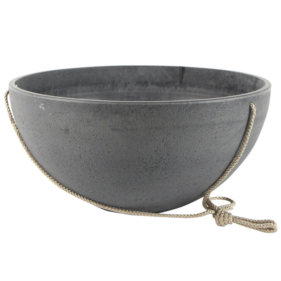 Hangende bloempot/plantenpot schaal van gerecycled kunststof en steenpoeder in de kleur donkergrijs met diameter 25 cm en hoogte 12 cm. Potten voor kamerplanten, buitenplanten of kunstplanten. Deze plantenpot voor buiten heeft een stijlvolle uitstraling in elk interieur. Een unieke duurzame mix van materialen dat nu geen afval is, maar een prachtige duurzame bloempot. Een sterke, mooie pot met ophang touw die vriendelijk is voor het milieu en de portemonnee. Deze serie potten hebben een eigen drainagesysteem onderin de pot.